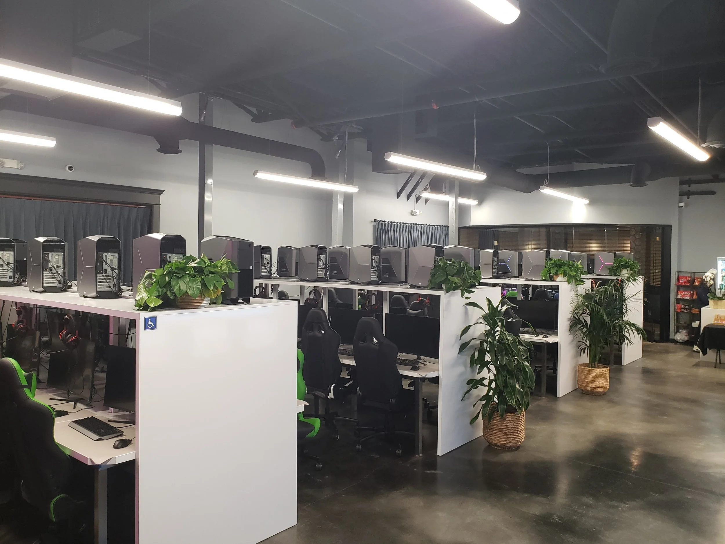 A modern gaming arena outfitted with cutting-edge stations and a central video wall for ultimate spectator engagement.